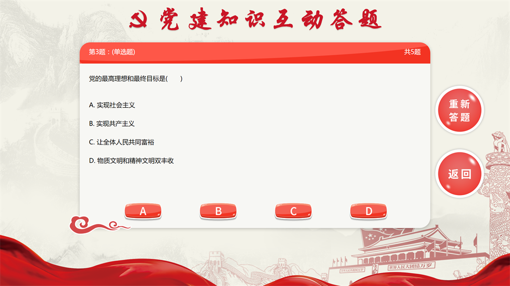 “党建知识答题软件”是随着现代知识竞赛党建文化发展,一种知识竞赛答题的新模式;可运用在:党建馆、展厅、社区、党群服务站、企事业单位等多种场合下,执行更高的互动展示成果,实现科技型应用软件发展技术,发挥出党建知识文化互动问答效果。