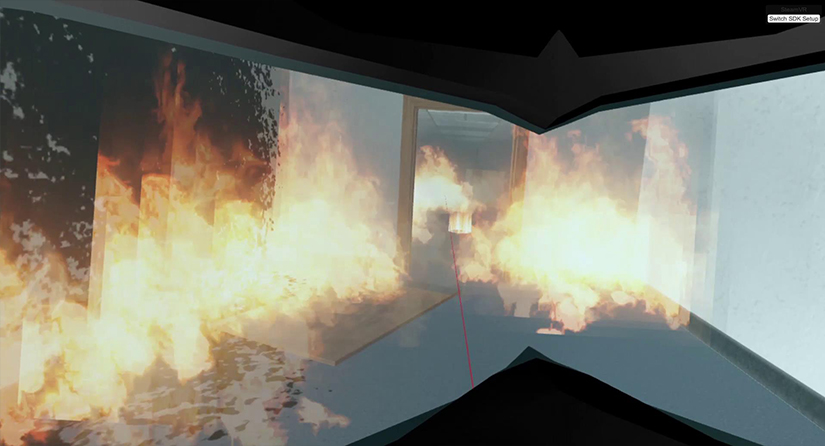 本系统基于三维建模、仿真引擎等技术,配合HTC-viveVR外设,模针公寓火灾发生,消防战士灭火并实施相应的应急措施救援体验。