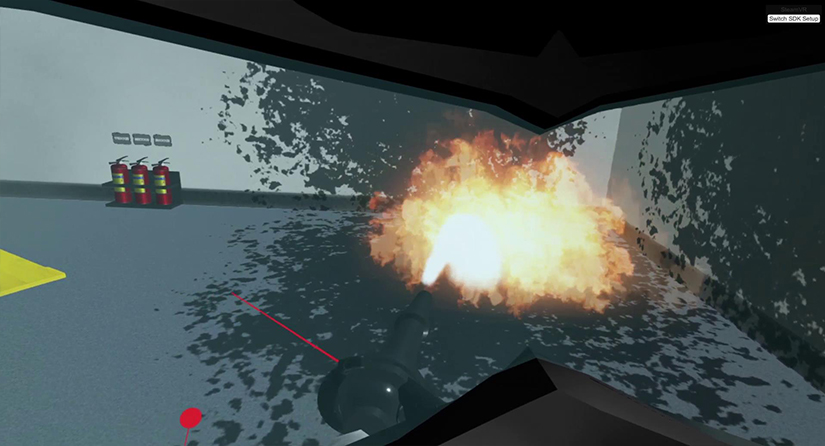 1. 体验者成功离开室内后,手拿喷水枪进行灭火,并出现火势滚滚,系统提示此时是黑烟并找到起火点UI;