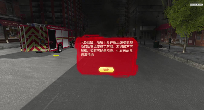 进入系统体验场景,出现背景介绍UI,提示某居民楼起火,起火原因不明等;