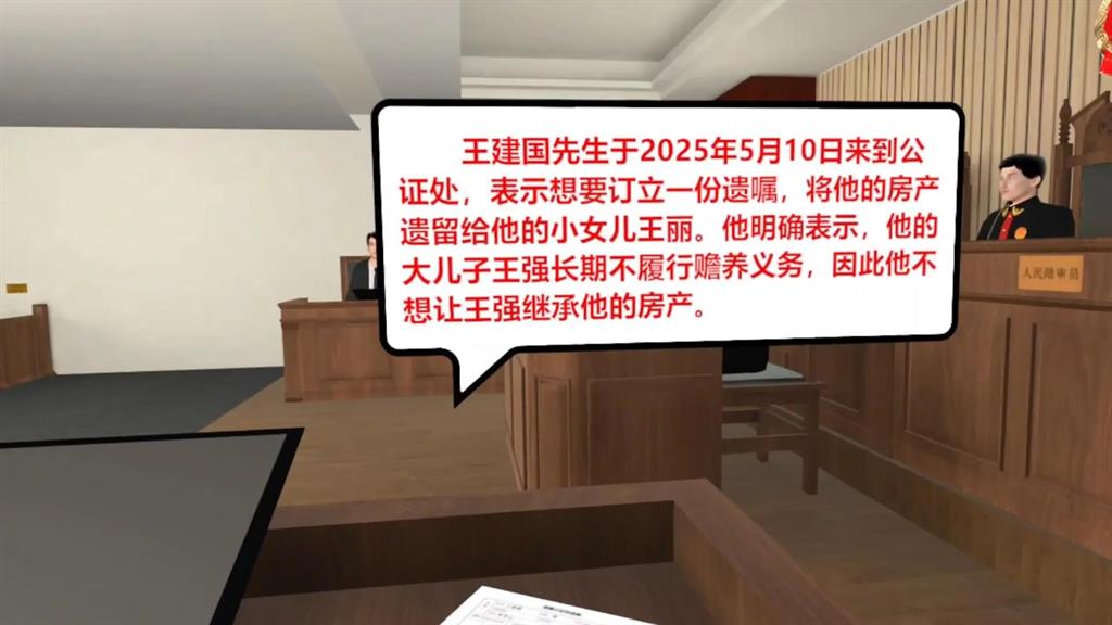 模拟成为一位公证员,体验遗嘱公证、出庭作证等公证业务流程,让用户在虚拟环境中深入了解公证业务的各个过程,提高业务理解和操作能力。体验完成后将进行答题测试,以检验用户对公证流程的理解程度及法律知识掌握情况。