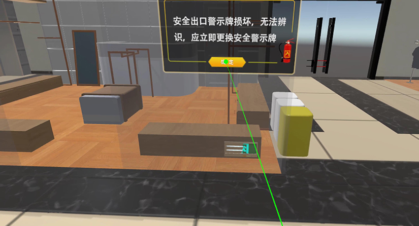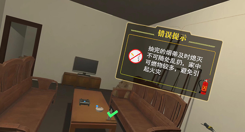 体验人员在90平方的房子中,体验人员可以在厨房、客厅、卧室移动,三个房屋空间中存在许多消防隐患,体验者需要一一指出。