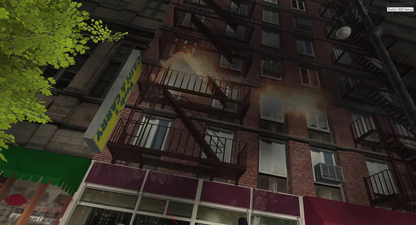 进入系统体验场景,出现背景介绍UI,提示某居民楼起火,起火原因不明等;