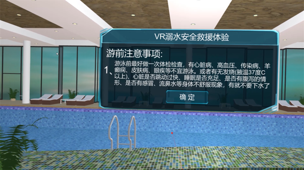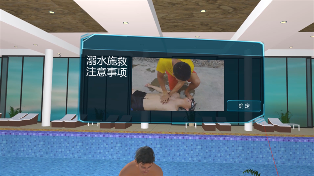 VR溺水救援教育体验是基于现实生活中的溺水场景进行还原,体验者以第一视觉的沉浸体验,在虚拟场景中学习遇到人员意外溺水后,我们作为施救者,应如何应对,如何采取有效措,如何施救,如何进行心肺复苏操作、如何自救等内容。