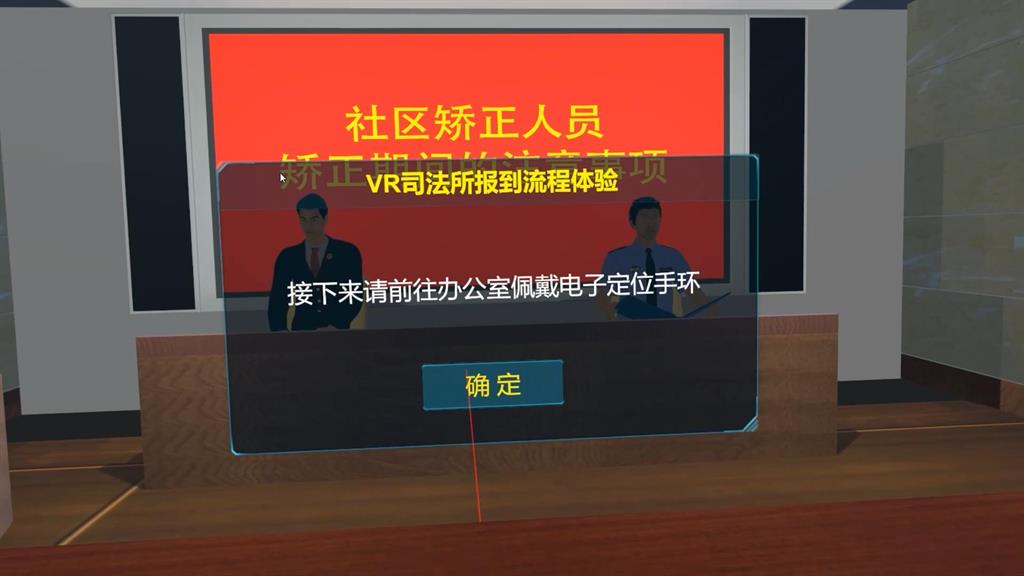 模拟整个司法报到和办理社区矫正等流程,体验者以第一视角携带相关证明到司法所完成相应的报到程序,包括进入司法所、填写信息、做心理健康测试、宣读矫正规定、佩戴电子手环等。