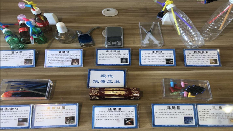 9种现代工具:电子秤、酒精灯、溜冰壶4个、锡纸、吸管、连接管、三通 镊子/微勺、鼻吸口服、注射法。
