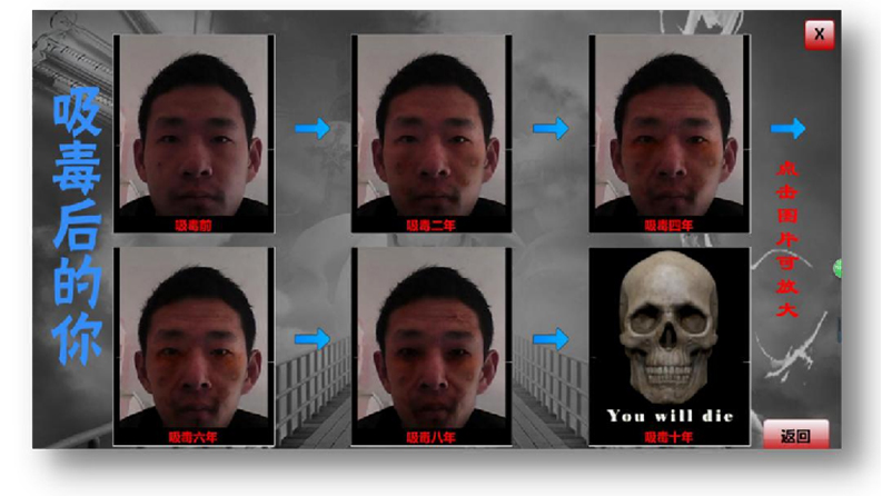 ★在屏幕上就会分别出现吸毒2年、吸毒4年、吸毒6年、8年后的吸毒面部变化。