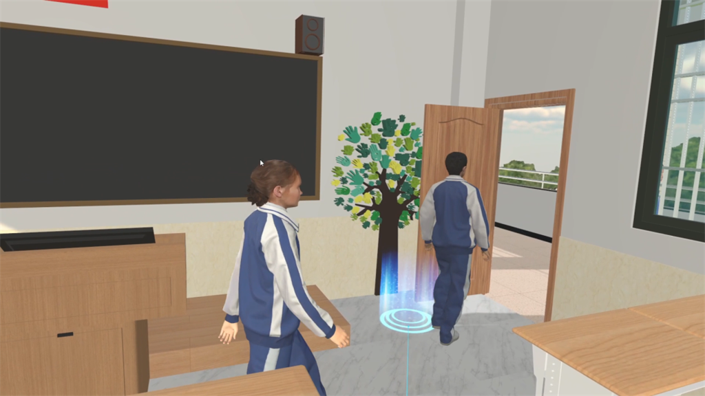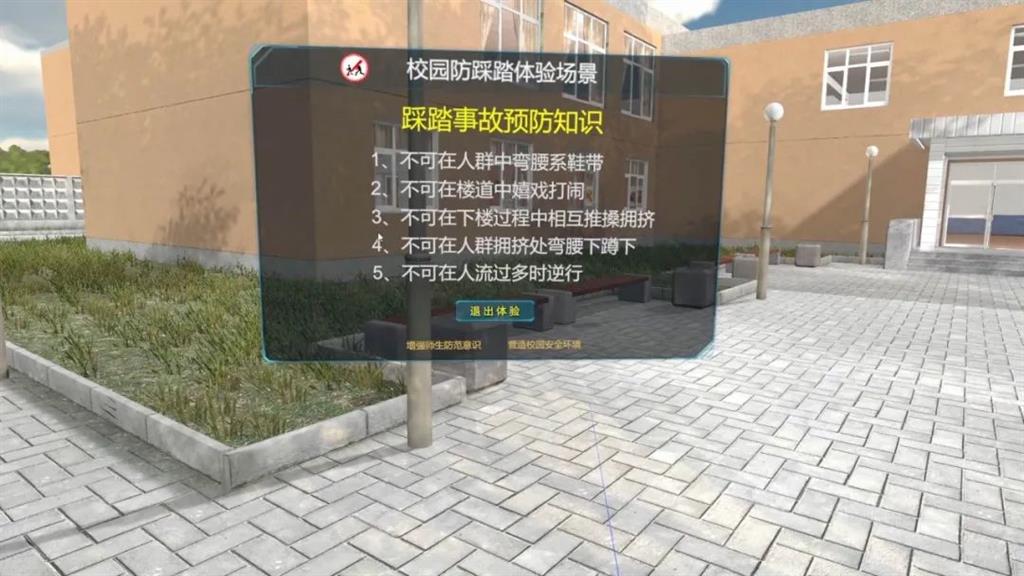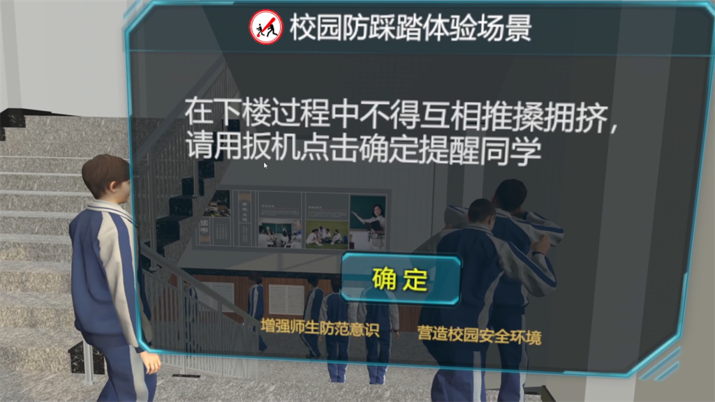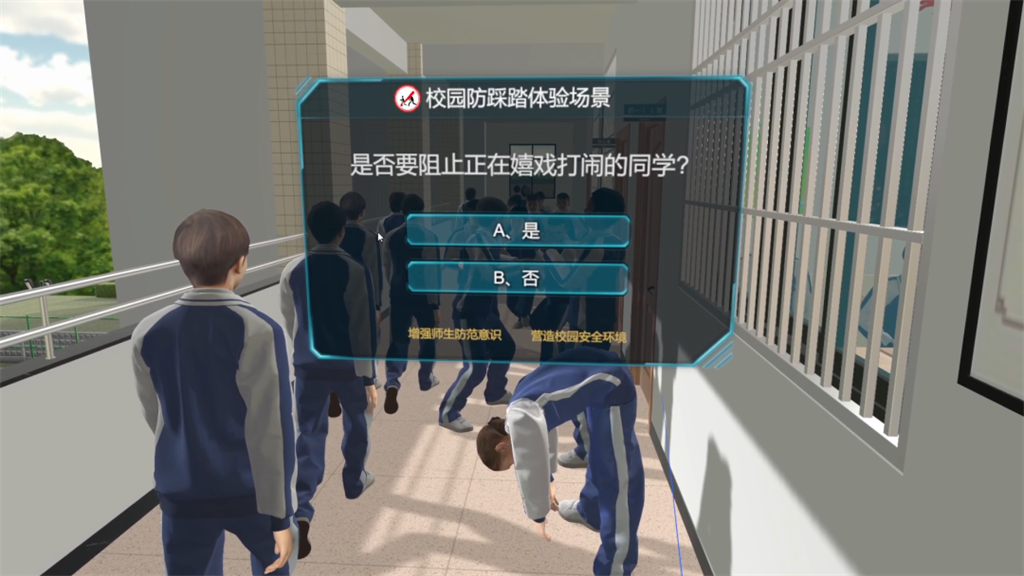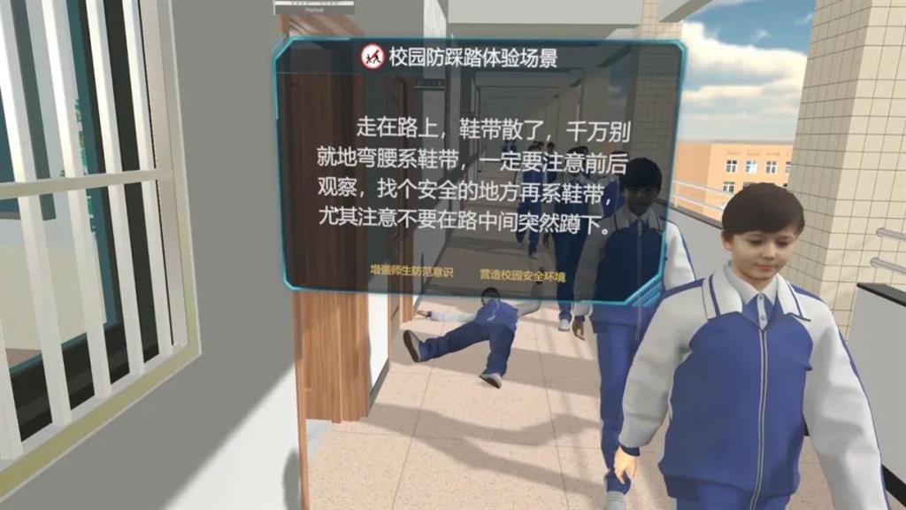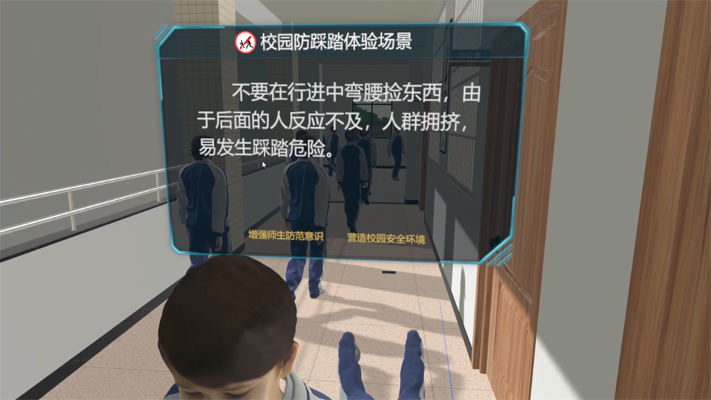 校园VR防踩踏体验场景软件从学校日常的早操入手,更具真实感与代入感;在校园早操准备过程中,学生们需集体前往操场,期间有同学在弯腰系带、楼道走廊内乱窜打闹、人群拥挤处弯腰下蹲捡东西、在人流处逆向跑步、在下楼楼梯时互相推操拥挤、在下楼楼梯发生意外跌倒后,后面未知的人群依然涌动前行的状况。