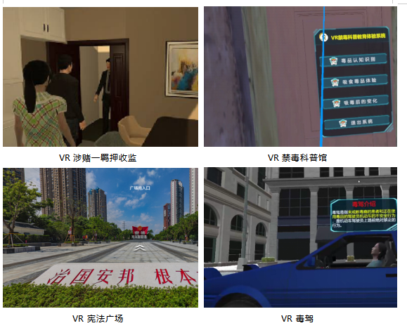 针对矫正人员在社会中可能遇到的高风险事件与环境,创建了《酒驾》《毒驾》《赌博》等多类型多主题的体验场景。通过模拟这些行为带来的严重后果,如交通事故、健康损害、家庭破裂等,加强矫正对象对社矫期间造成不良后果的认识,从而增强其身份认识和守法意识。同时为了帮助社区矫正对象增强法治意识,从社区矫正对象转变为“法律明白人”,创建《禁毒科普》《防诈骗》《宪法广场》、《廉政馆》等法律法规宣传内容,让矫正对象学习,以此树立正确的人生观和价值观。除此之外,还是设计《VR监狱生活体验》场景,通过利用VR技术全方位呈现监狱环境,让矫正人员能身临其境地感受违反犯罪后被收监执行的监狱生活,以此加强社矫对象的身份认识和守法意识,起到震撼警示教育作用。