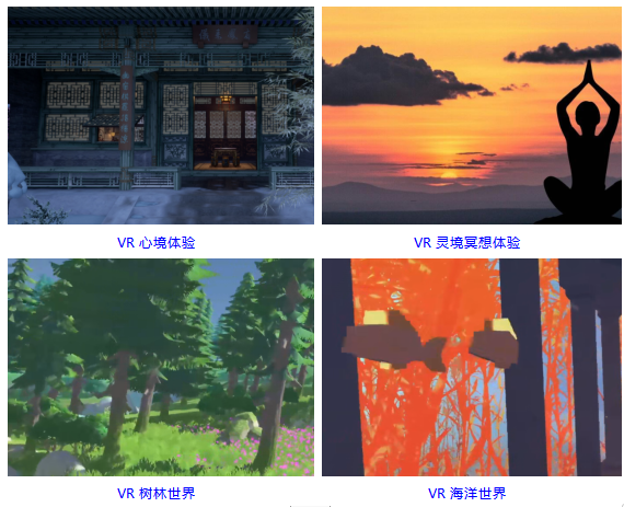 对于精神压力较大、具有焦虑、抑郁等负性情绪的对象,则利用3D全景视频,构建了《VR心境体验》、《VR海洋世界》、《VR灵境冥想体验》、《VR树林世界》等轻松场景,再结合内观疗法、音乐治疗等心理学疗法,从生理、心理两方面缓解精神压力,舒缓焦虑、抑郁等负性情绪。