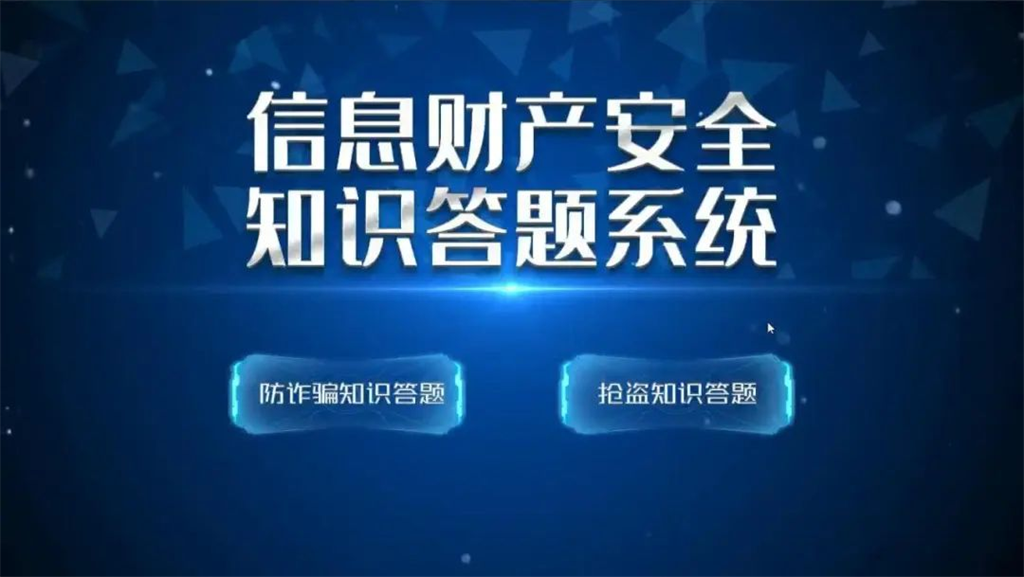 设备待机画面为“信息则产安全知识答题系统”动态演绎,下面分为防诈骗知识答题模块和抢盗知识答题模块。