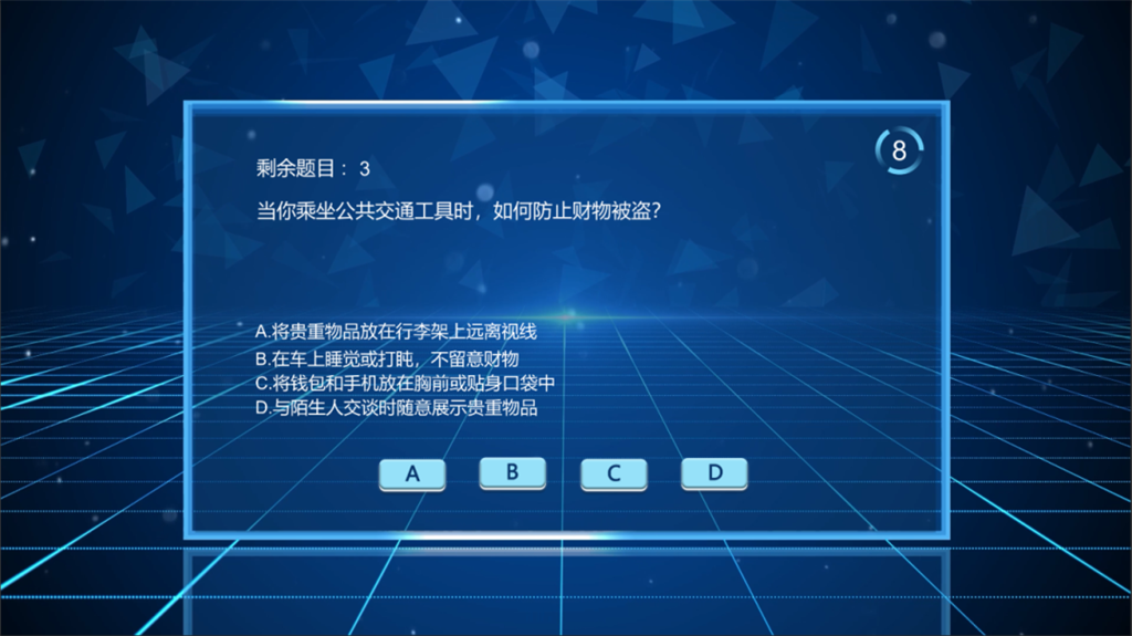 针对抢盗风险,系统以互动答题的形式模拟日常生活中可能遇到的抢劫、盗窃等突发情况。例如,在公共场所的休息区,如何防止财物被盗,或在公共场所财物被盗等场景。用户需要在模拟情境中选择正确的应对措施,系统会根据用户的选择提供实时反馈,帮助用户学习如何冷静应对,采取正确的自我保护措施。