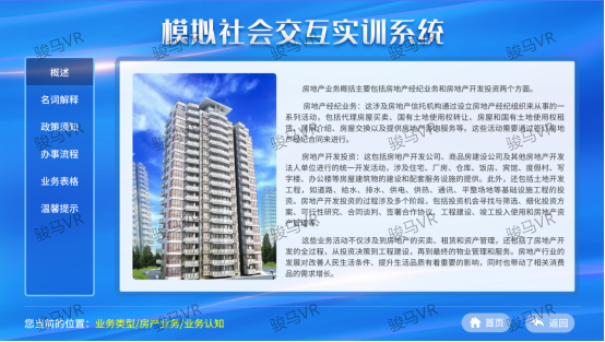 模拟社会交互实训系统具备6种模拟业务办理知识,涵盖民政、房产、公证、工商、司法所及派出所等关键社会服务领域,每个模块均细分为5个子部分,分别是绘声绘影、业务认知、法律讲堂、随堂测验、联系直通车,旨在通过多角度、多层次的交互体验,深化服刑人员对每一个业务流程的理解和掌握。