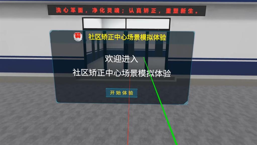 进入VR场景,体验者站在社区矫正中心大门前,点击手柄即可进入内部。大厅内,系统语音随即介绍中心的主要职责与区域划分。随后,体验者可自由漫游至各功能室,系统会详细介绍每室的功能及在社区矫正中的作用。此外,大厅还设有互动答题环节,增强体验趣味性与知识性。