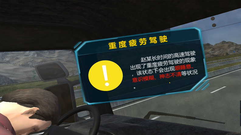 随着夏季高温和物流旺季的到来,疲劳驾驶问题日益突出,尤其是对于夜间行驶的货车驾驶员。驾驶员在疲劳的情况下驾驶车辆,会感到困倦瞌睡,四肢无力,注意力不集中,判断能力下降,甚至出现精神恍惚或瞬间记忆消失,出现动作迟误或过早,操作停顿或修正时间不当等不安全因素,极易发生道路交通事故。体验者将会体验到在高速上体验到轻微疲劳驾驶、中度疲劳驾驶、重度疲劳驾驶以及疲劳驾驶应急处理措施等。