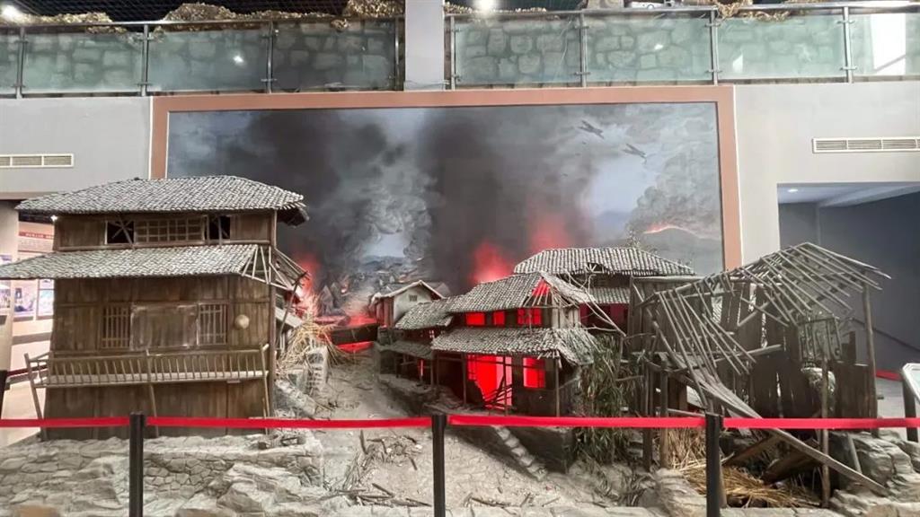 该区域为纪念馆还原场景区,其中轰炸场景是通过利用现代的声光电技术制造出逼真效果,再配合氛围灯光,模拟还原历史中日军飞机在头顶上方的投弹、房屋被摧毁发出剧烈爆炸的场景;芙蓉战斗是根据现场场景要求,安装壁挂有源音响并配合芙蓉战斗场景,还原展示抗战历史事迹;两块场景也使还原使纪念馆展览更加具有立体视觉感、艺术观赏性、参与互动性和宣传教育功能。
