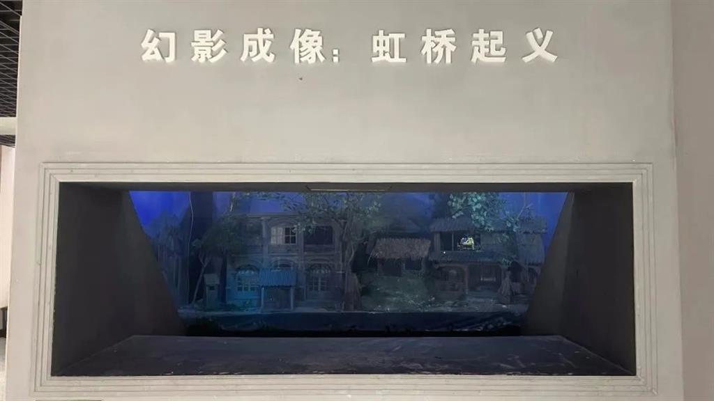 幻影成像系统,呈现虹桥起义的内容展现。利用多机多方位摄像技术及人眼视觉心理特性,再将所拍摄区域将投影画面投射在特制媒介玻璃上,与实景模型结合,合成最终3D画面,演绎出虹桥起义故事。